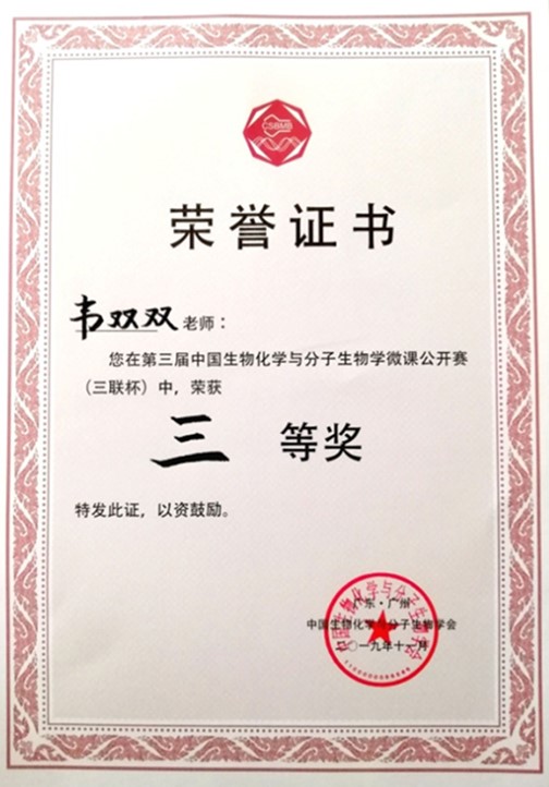 生物化学与分子生物学是生命科学和生物医学等学科的核心专业。为促进教学理念、思路、设计和方法的创新实践与交流,提高各高等院校的专业教学水平,中国生物化学与分子生物学会教学专业分会于2019年11月22-25日在广东广州举办“第三届中国生物化学与分子生物学微课公开赛(三联杯)暨第二届优秀教师训练营”。各省级生物化学与分子生物学会推荐1名教师参加竞赛,经过一天的激烈角逐,脱衣秀 韦双双老师获得此次大赛三等奖。