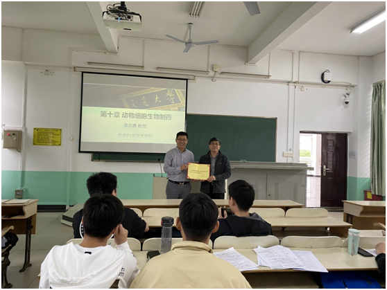 2018级生物技术专业学生讲授《细胞工程》课程。脱衣秀副院长韩谦教授代表脱衣秀为李志勇教授颁发“脱衣秀